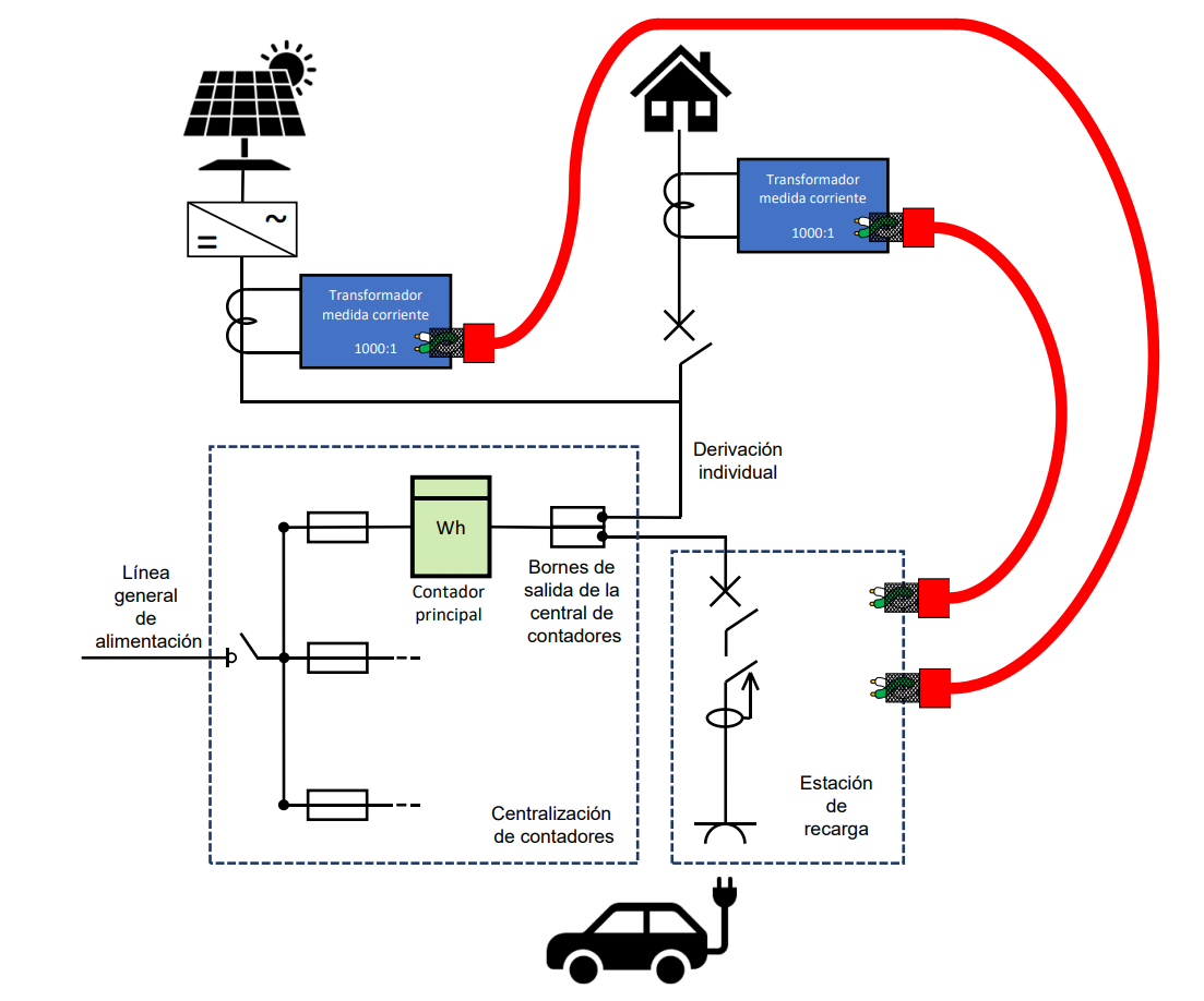 En el caso de que el cargador monofásico, PRO o SELECT, ya se encuentre instalado y tenga dos sondas instaladas el esquema que deben seguir es el siguiente.