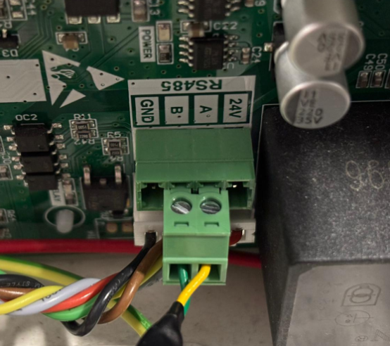 En el circuito de control del cargador, este conector de 2 pines se ha de pinchar en los contactos CENTRALES del conector de 4 pines que hay en placa, marcado como RS485.