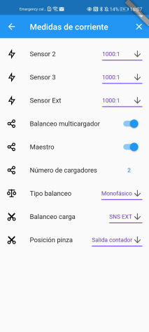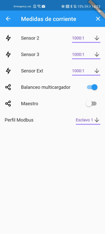 En la instalación de balanceo multicargador debe haber obligatoriamente un único cargador con el rol de maestro. Este se encarga de ejecutar el algoritmo de balanceo. Se configura mediante el menú de medidas de corriente. Se debe activar la opción de balanceo multicargador y la opción de maestro. Además se debe introducir el número cargadores que actuarán en el balanceo.