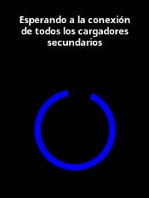 Cuando arrancan el cargador maestro intenta buscar a los otros cargadores. Durante esta fase aparecen las siguiente pantallas. Una diferencia que hay entre los dos roles es que en el caso del maestro se esperará a conectar con el número de esclavos configurados o 30 segundos antes de acabar el arrancar y salir de esta pantalla, mientras que en el caso de los esclavos no saldrán de esta pantalla ni acabarán el arranque hasta que el cargador maestro les contacte.